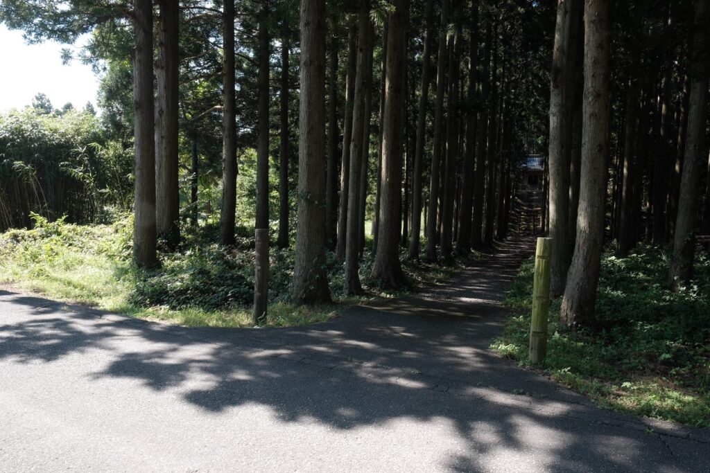 駐車場にある小屋から目的の「小杉の大杉」が見えています。